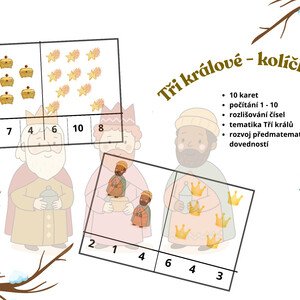Soubor obsahuje 10 karet s tematikou Tří králů na procvičení předmatematických dovedností a to konkrétně počítání 1-10