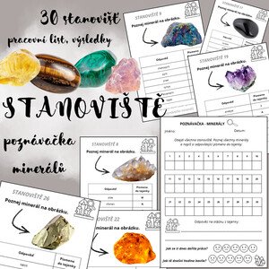 Poznávačka minerálů 30 stanovišť děti vybírají, který minerál je na obrázku výsledky zapisují do pracovního listu, kde