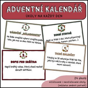 Adventní kalendář. Uvnitř najdete průvodní dopis, kolečka s čísly na označení třeba pytlíčků a 30 úkolů, mezi kterými si