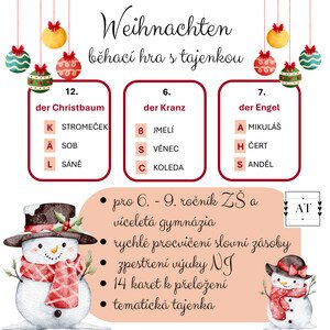 Vánoční pohybová hra do hodiny němčiny. Obsahuje 14 karet + list k napsání tajenky. Každá karta obsahuje německé