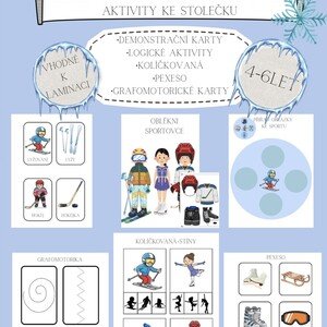 Soubor obsahuje 20 obrázků ve formátu A4 jako názorná pomůcka pro seznámení dětí s pestrým světem zimních sportů, které