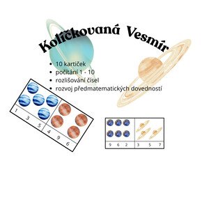 Soubor obsahuje 10 karet s tematikou Vesmíru na procvičení předmatematických dovedností a to konkrétně počítání 1-10
