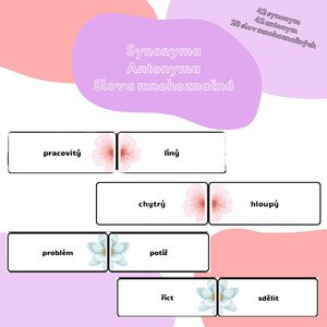 Materiál obsahuje 20 slov ve dvou variantách písma – hůlkové a psací. Ke každému slovu je přiřazen obrázek, který slouží