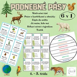 Soubor obsahuje: 48 kartiček s typickými znaky podnebných pásů, rostlinami a živočichy 30 obrázků k přiřazování k
