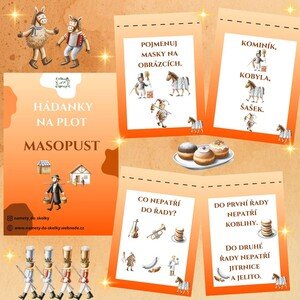 Jedná se o hádanky na plot s názvem "Masopust." Postup výroby: vrchní část oranžové barvy je přepůlená přerušovanou