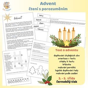 Najdete zde: text o adventu, ve kterém chybí 5 slov. Chybějící slova může vyučující rozmístit po třídě, žáci je hledají