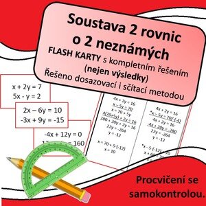 Materiál obsahuje 18 flash karet. Na jedné straně je soustava 2 rovnic o 2 neznámých. Na druhé straně je kompletní