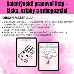 Co materiál obsahuje sadu valentýnských pracovních listů zaměřených na vztahy, emoce a sebepoznání tvořivé aktivity