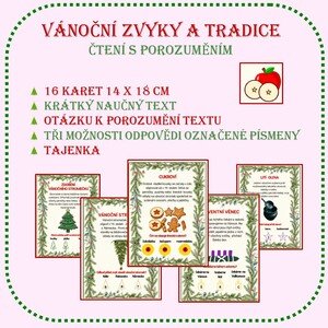 16 karet o velikosti cca 14 x 18 cm Materiál obsahuje karty s texty o vánočních zvycích a tradicích (např. vánoční