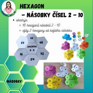 Materiál obsahuje: 18 hexaganů násobků 2 - 10 vždy 2 hexagony od každého násobku Cílová skupina: Žáci 2.–4. ročníku ZŠ