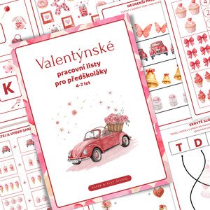 Valentýnské pracovní listy pro děti 4–7 let (35 stran): grafomotorika, počítání, jazykové hry, bludiště a zábavné úkoly.