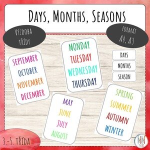 Soubor obsahuje barevné plakáty s anglickými názvy dnů v týdnu, měsíců a ročních období ve formátu A3 a A4. Plakáty se