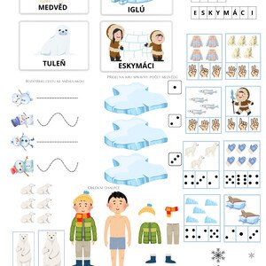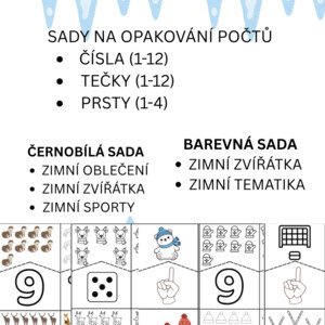 Soubor zimní počty obsahuje 35 kartiček pro opakování počtů. Je zde 5 sad a každá má 3 varianty kartiček - čísla, tečky
