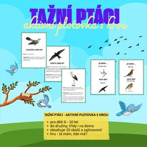 TAŽNÍ PTÁCI - AKTIVNÍ PLOTOVKA S HROU Co vše obsahuje: ✅ 10 kartiček formátu A5 s úkoly a zajímavostmi ✅ 22 kartiček s