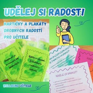 Materiál obsahuje 32 kartiček (dvě barevné varianty) a 2 plakáty s nápady na drobné radosti, které přispívají k