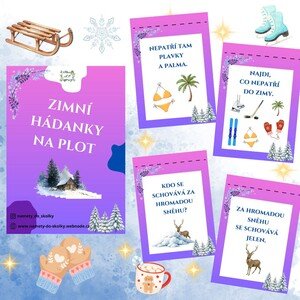 Jedná se o hádanky na plot s názvem "Zimní hádanky." Postup výroby: vrchní část fialové barvy je přepůlená přerušovanou