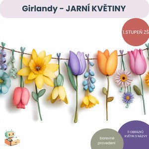 Tento jarní materiál je určen pro 1. stupeň ZŠ. Obsahuje 11 praporků, které tvoří ucelenou girlandu s názvy a obrázky