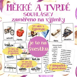 Materiál obsahuje 54 slov, kde jsou výjimky u měkkých a tvrdých souhlásek. Slova jsou na kartičkách i s obrázky. Dále