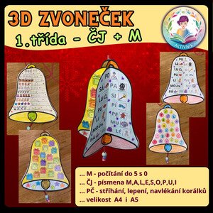 Zvoneček 3D je tvořivý vzdělávací materiál pro žáky 1. třídy, který propojuje čtení, počítání a výtvarnou činnost v