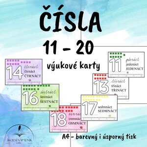 Karty s čísly od 11 do 20 vhodné jako vizuální podpora. Karty jsou ve velikosti A4. Duhové nebo i ve verzi úsporné pro