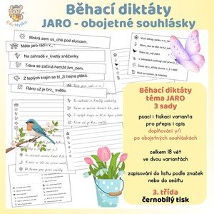 Tři sady vět pro běhací diktát, pro přepis nebo opis s doplňováním y/i po obojetných souhláskách. Celkem 18 vět - všechny psacím i tiskacím písmem. Možnost zapisování vět do sešitu nebo do připravených listů podle obrázků.
