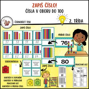Soubor obsahuje: 100x kartička se zobrazením čísla 100x s čísly 1 - 100 1x pracovní list A5 24x kartička s textem