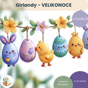 Tento velikonoční materiál je určen pro 1. stupeň ZŠ. Obsahuje tři typy girland se stejným designem, ale s jiným nápisem