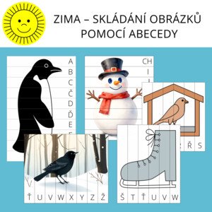 Materiál obsahuje skládačky pěti zimních obrázků (tučňák, sněhulák, pták v krmítku, brusle, pták v zimě). Vybrané