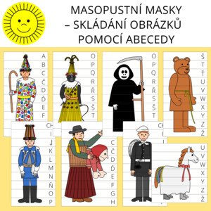 Materiál obsahuje skládačky osmi masopustních masek (laufr, Turek, pohřebenář neboli slaměný, medvěd, bába s nůší