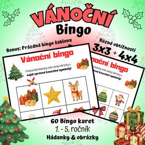 ✨ Co najdete uvnitř 60 různých bingo karet 30 × 3×3 bingo – jednoduché, rychlé, vhodné i pro prvňáčky 30 × 4×4 bingo – o
