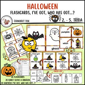 Soubor obsahuje 20 barevných demonstračních karet s obrázky patřícími k svátku Halloween, 20 dvojic kartiček s obrázkem