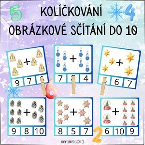 Obrázkové sčítání do 10 – zimní kolíčkování Procvičte s dětmi sčítání do 10 zábavnou formou! Každá kartička obsahuje