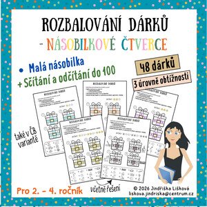 Popis materiálu: Tento materiál obsahuje 12 pracovních listů s dárečky - násobilkovými čtverci. Na každém listu jsou 4