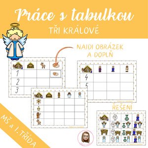 Didaktický materiál s tematikou Tří králů zaměřený na práci s tabulkou, zrakové vnímání a logické myšlení. Děti doplňují