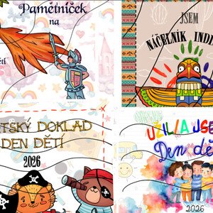 Soubor pamětních listů a medailí s motivy pirátů, Indiánů, pohádek a obecný pro Den dětí 2026 a univerzální na další