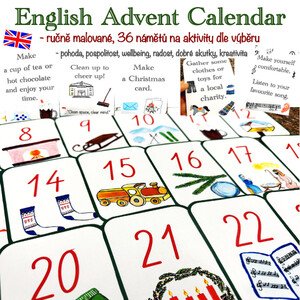 Adventní kalendář obsahuje 24 karet s ručně malovanými obrázky a dalších 36 karet s náměty na aktivity v anglickém
