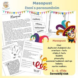Text o masopustu, do kterého je potřeba doplnit několik chybějících slov. Otázky a úkoly k textu, zábavné úkoly - bludiště, rébusy, hádanky, poznávání hudebních nástrojů. Vytváření vlastní maškary.