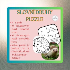 10x oboustranné 4dílné puzzle děti k sobě přiřazují všechny 4 dílky - číslo, slovní druh, jeho stručná definice a