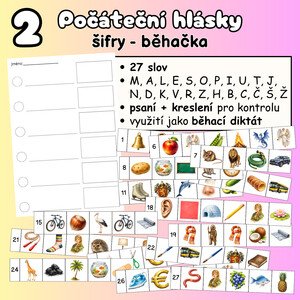 Aktivita zaměřená na počáteční hlásky a psaní slov. Slova jsou zašifrována pomocí obrázků – děti určují počáteční hlásky