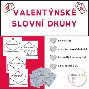 Materiál Valentýnské slovní druhy obsahuje 90 karet s krátkými větami. Tyto věty jsou zpracovány s ohledem na
