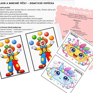 Klaun a barevné míčky Děti pracují s obrázkem klauna s barevnými míčky. Jejich úkolem je připínat kolíčky stejné barvy k