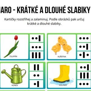 V souboru naleznete 58 kartiček s jarní tématikou. Děti pojmenují předmět na obrázku a mají za úkol určit krátké a