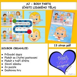 Materiál je určen do hodin AJ pro 1. stupeň ZŠ. Soubor obsahuje slovní zásobu na téma části lidského těla, plakáty