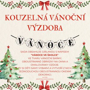 Materiál VÁNOCE VE ŠKOLCE obsahuje: Girlandu s nápisem "Vánoce ve školce" ve tvaru vánoční ozdoby. Oboustranné obrázky