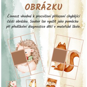 Činnost vhodná k procvičení přiřazení chybějící části obrázku. Soubor lze využít jako pomůcku při předškolní diagnostice