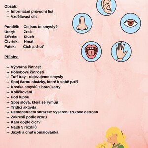 POZNÁVÁME SMYSLY V MŠ, týdenní plán Obsah: Informační průvodní list Vzdělávací cíle Pondělí: Co jsou to smysly? Úterý