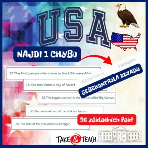 36 kartiček se základními fakty o USA - každá věta obsahuje 1 chybu. Žáci ji musí najít a nahradit správným slovem