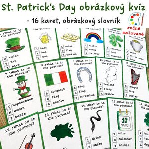 Materiál obsahuje 10 A4 stran – 16 karet s otázkami, list k zápisu odpovědí, obrázkový slovníček. Otázky si můžete číst