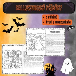 Děkuji za zakoupení mého materiálu. Materiál obsahuje: 5 příběhů (textů) s tematikou Halloweenu a 5 omalovánek, které