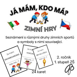 Soubor obsahuje 24 kartiček na hru Já mám, kdo má? s tématem zimních sportů. Hra je určena pro děti v mateřské škole a